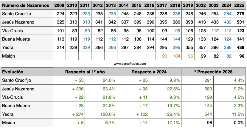 La Madrugada del Viernes Santo constituye una de las jornadas con mayor singularidad dentro de la Semana Santa de Jerez, tanto por su carácter nocturno como por la fuerte carga simbólica y devocional asociada a sus hermandades. En el periodo 2009–2025, la evolución del número total de nazarenos muestra una tendencia de crecimiento moderado, con fases de estabilidad intercaladas con incrementos progresivos en determinados tramos del periodo analizado.