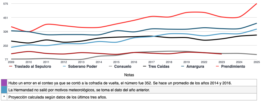 A diferencia de otras jornadas más expuestas a procesos de reconfiguración, el Miércoles Santo mantiene una estructura relativamente estable de hermandades, lo que facilita la lectura longitudinal de la serie. Esta estabilidad estructural permite atribuir la mayor parte del crecimiento observado a dinámicas internas de las corporaciones, más que a cambios en la composición del día.