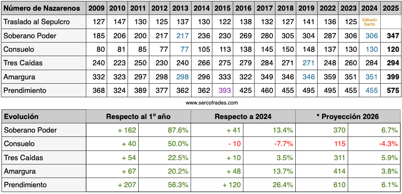 El Miércoles Santo presenta, a lo largo del periodo 2009–2025, una evolución caracterizada por un crecimiento sostenido del número total de nazarenos, con oscilaciones puntuales que responden al comportamiento específico de algunas hermandades, pero con una tendencia agregada claramente ascendente. La jornada se consolida así como uno de los ejes centrales de la Semana Santa jerezana en términos de participación.