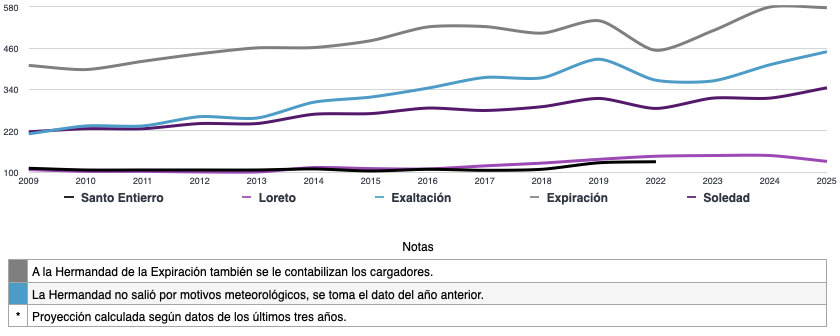 Como en el resto de jornadas, los años 2020 y 2021 no figuran en la serie debido a la suspensión de las procesiones durante la pandemia de COVID-19. La evolución a partir de 2022 muestra una recuperación gradual, situando al Viernes Santo en niveles de participación comparables o ligeramente superiores a los registrados antes del paréntesis pandémico, en línea con la tendencia general de recuperación del conjunto de la Semana Santa.