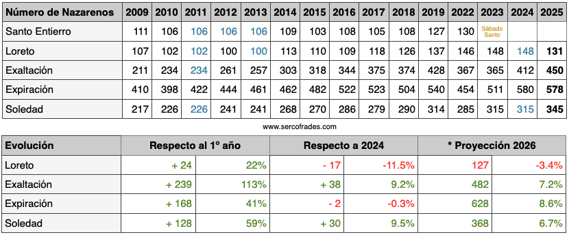 A diferencia de jornadas con mayor movilidad de hermandades, el Viernes Santo mantiene una composición estable, lo que permite interpretar las variaciones del total del día como resultado, principalmente, de la evolución interna de las corporaciones. En este sentido, el crecimiento observado en los últimos años responde a incrementos paulatinos en el número de nazarenos de algunas hermandades, más que a cambios estructurales en el mapa de la jornada.